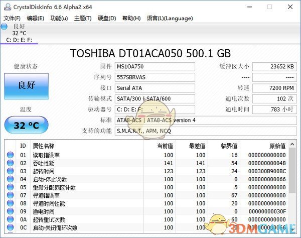 2、软件是一个硬盘健康监控工具的小软件,通过读取S.M.A.R.T来了解硬盘的健康状态。
